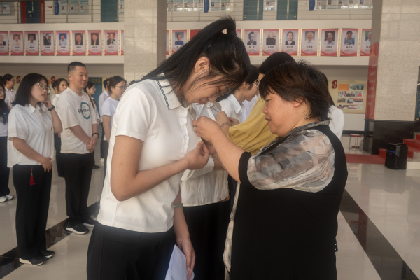 教工党员代表为新转正员工党员佩戴党徽 柳伟摄影