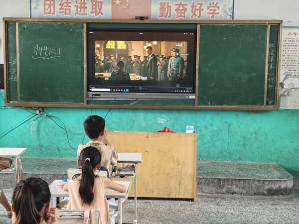 随后,支教队员们为孩子们播放了革命历史题材电影《建军大业》。当银幕上出现南昌起义的激烈战斗场面、战士们冒着枪林弹雨冲锋陷阵的镜头时,原本喧闹的教室瞬间安静下来,孩子们紧盯着画面,不少人眼中泛起了泪光。电影中,周恩来、贺龙、叶挺等革命先辈为了理想信念浴血奋战的场景,让孩子们深受震撼。