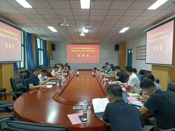 8月12日,石大胜华新材料集团股份有限公司董事长郭天明、总经理于海明、石大胜华先进能源材料研究院经理陈勇等一行8人到访学院,就校企合作、成果转化开展交流。本次会议由经理刘欣梅主持,副经理胡涵、金鑫、党委副书记徐光辉、重质油全国重点实验室主任田原宇等参会交流。