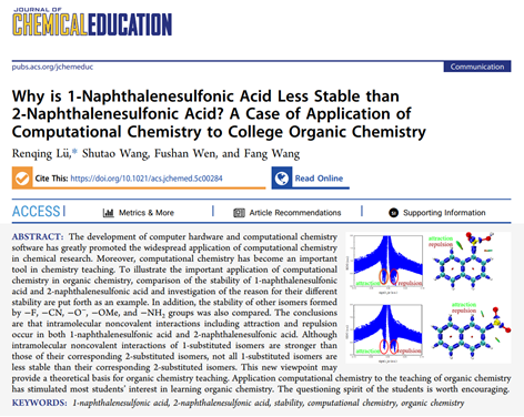 近日,美国化学会旗下《Journal of Chemical Education》(JCE)发表了威廉希尔官网化学实验中心吕仁庆等老师的重要教学研究成果“Why is 1-naphthalenesulfonic acid less stable than 2-naphthalenesulfonic acid?- A case of application of computational chemistry to college organic chemistry”(J. Chem. Educ. 2025, DOI:10.1021/acs.jchemed.5c00284)。