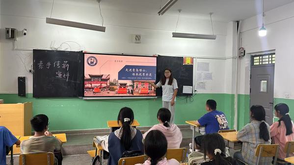 8月14日,实践队员杨欣姗在甘肃省甘南藏族自治州迭部县初级中学,通过故事分享会的形式,生动展现青岛非遗的传承故事。100多名员工们聆听着背后的山海故事,在互动中感受沿海与高原文化的碰撞,让崂山区非遗在千里之外的校园扎根生长。