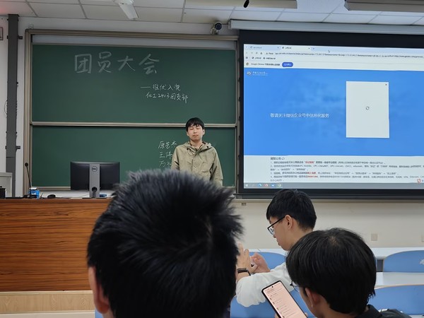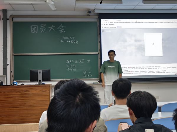 2025年9月24日晚,化工2403团支部于南教306成功举办推优入党大会,旨在推选入党积极分子,为党组织输送新鲜血液,激励团员积极向党组织靠拢。本次大会由团支书宋明轩主持,辅导员车桐宇以视频会议参会,大部分团员参与。