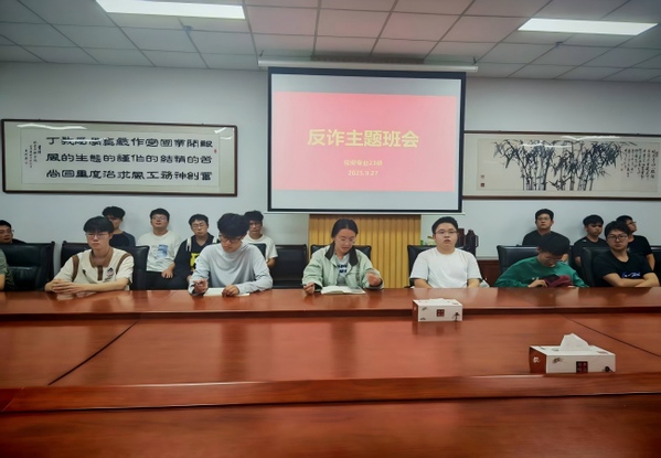 为切实提高老员工的识骗防骗能力,遏制诈骗案件多发势头,9月27日下午五点,化工安全工程专业在工A121召开了“筑牢防诈墙,守护幸福家”的主题班会。本次会议由化安2301班班长郭禧乐主持,辅导员李文轩、张学东和化安专业全体员工参会。