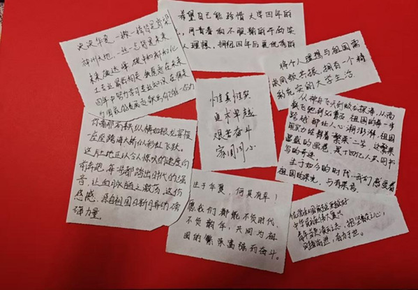 在主持人的讲解下,同学们对爱国精神的内涵有了更进一布的了解,于是主持人邀请在场的每一位同学都在一张白纸上匿名写下一段关于“作为一个个体,我们应当如何弘扬爱国精神?”的看法。在每一位同学都给出了心仪的想法后,主持人将各位的想法收集了起来。果然,每一位同学都给出了相当精彩的答案。(以下仅展示部分)自此本次本次班会圆满结束。