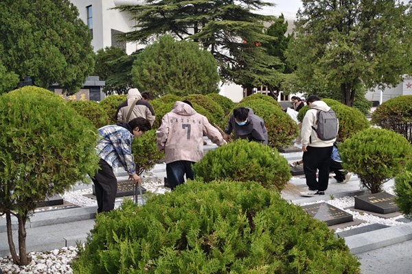 参观结束后,同学们迅速投入到志愿服务中。大家纷纷拿起的扫帚、纸巾、垃圾袋等工具,分工协作,有条不紊地开展清扫工作。有的同学弯腰仔细清扫陵园内的落叶与杂物,不放过任何一个卫生死角;有的同学则小心翼翼地擦拭墓碑,用双手拂去尘埃,让每一块镌刻着英雄名字的墓碑都显得格外洁净庄重。尽管天气微凉,但同学们热情高涨,以实际行动表达对革命先烈的缅怀与敬意,整个劳动过程中,现场秩序井然,氛围肃穆。