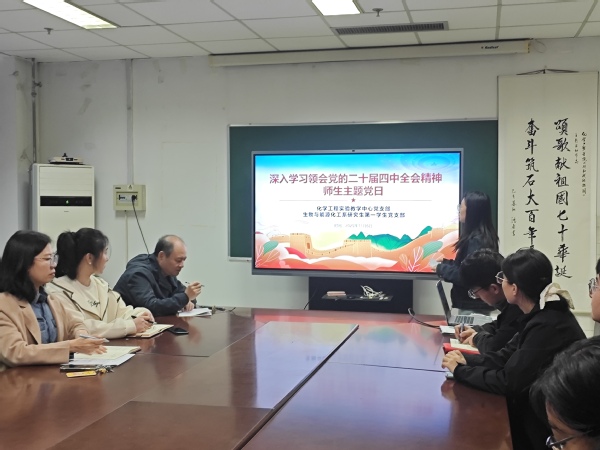 党的二十届四中全会顺利闭幕后,学习贯彻全会精神成为全党全国的重大政治任务。为切实把思想和行动统一到党中央决策部署上来,化学工程实验教学中心党支部联合生物与能源化工系研究生第一员工党支部,于11月6日下午在工科A335召开学习党的二十届四中全会精神专题会议。本次会议由教工党支部书记张淑霞同志主持,聚焦“深入学习领会党的二十届四中全会精神”主题,议程涵盖全会精神领学、师生代表发言、交流研讨及总结部署四个环节。