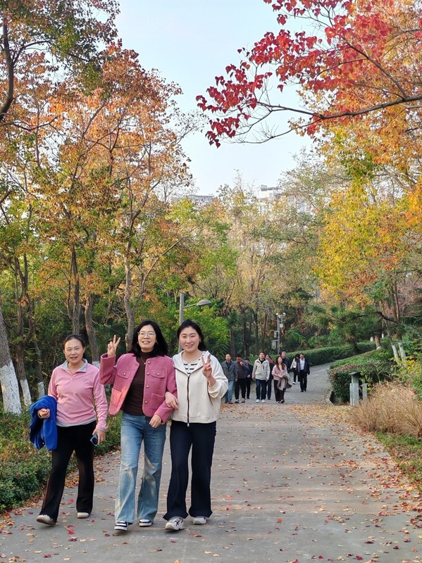 学院工会主席孙昱东在出发前作了简短动员,他表示,健康的体魄是高效工作的基础,希望通过此次健步行活动,让大家在紧张的教学科研工作之余,走进自然、放松身心,同时增进彼此间的交流与情谊。随后,健步行活动正式开启。队伍从小黄山脚下出发,沿蜿蜒的山路拾级而上。老师们三五成群,结伴而行。一路上,欢声笑语不断,与山间的鸟鸣声交织成一首动人的秋日乐章。大家时而畅谈工作中的心得,时而交流生活中的趣事,时而驻足欣赏漫山遍野的秋色,用手机记录下美好的瞬间。平时在教室和实验室里严谨专注的教师们,此刻化身为充满活力的登山健儿,展现出课堂之外的风采。