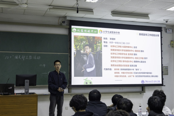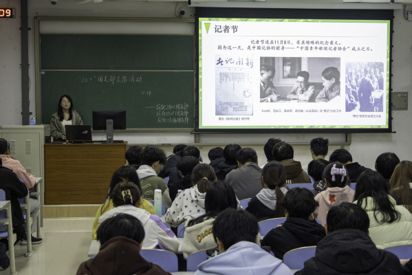 2025年11月15日,应用化学2501团支部、应用化学2503班团支部于南教114联合开展融媒体宣传主题宣讲。活动特邀化老员工融媒体中心摄影部部长张楚林和新媒体编辑部部长助理石仓旭主讲,旨在夯实青年宣传思想工作基础,提升新闻宣传专业能力,筑牢校园主流舆论阵地。