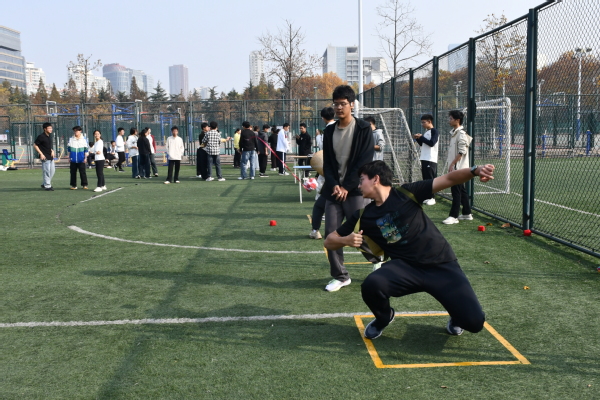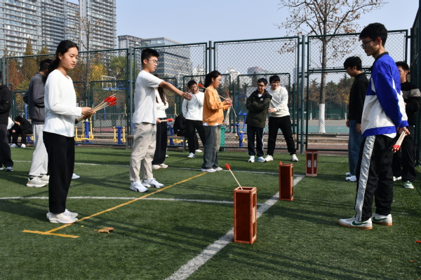 活动前,员工会团队细致筹备场地与规则,辅导员曹建琳宣布活动开始后,现场氛围瞬间被点燃。运动会设置“背篓绣球”“投壶”“快乐一条龙”“趣味文体混合接力”四项集体项目,虽形式各异,但都成为新生释放情绪、拉近距离的纽带:有人为配合投球反复沟通,有人在投壶失利时互相打气,有人绑腿行走时扶住踉跄的队友,有人转圈后识曲时笑着分享“眩晕里的快乐”,赛场满是欢声笑语,陌生感在互动中悄然消散。