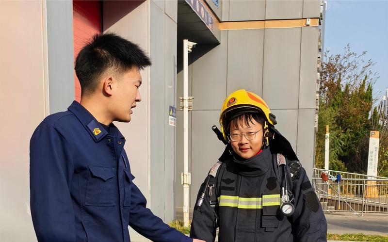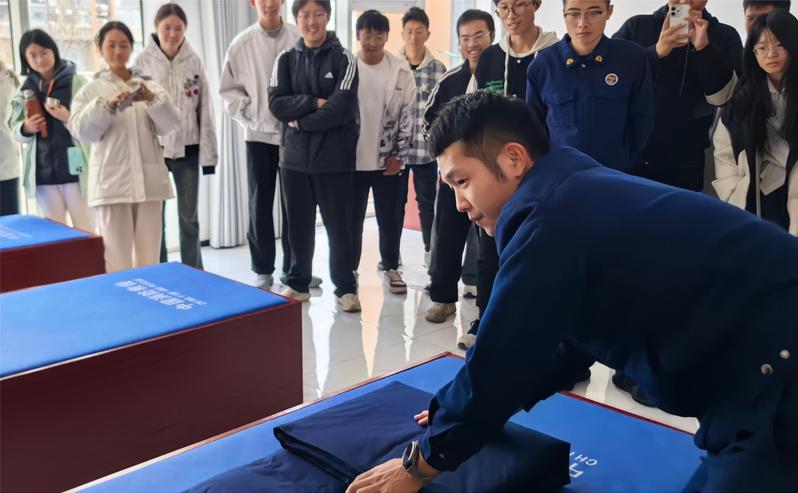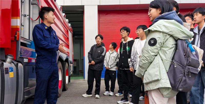 在训练场地,翟子涵详细介绍了高处迫降、攀登、负重跑等日常训练项目,同学们现场观摩了训练设施,对消防员高强度的训练要求有了直观了解。随后参观的内务整理区和119接警处置流程,展现了消防队伍严谨的纪律作风和高效的应急响应机制。