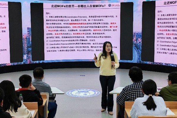 随后,戴教授生动阐释了MOFs的多维结构与核心合成方法。她通过羧酸、咪唑类有机配体等相关例子,深入浅出地讲解了含孤对电子原子的有机配体与金属离子间配位键的定向设计及形成,以及如何通过合理选择金属和有机配体,来实现对MOFs孔隙环境、尺寸及功能的“定制化”合成,从而满足特定应用需求。