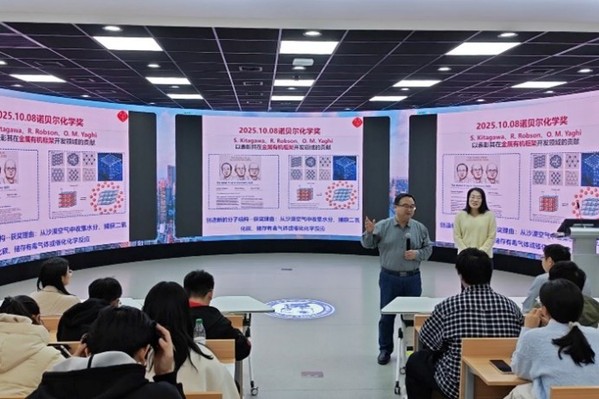 11月23日,威廉希尔体育(华东)材料科学与工程学院戴昉纳教授做题《解码诺奖·启迪思维——2025年诺贝尔化学奖深度解读》的“拔尖论坛”第一期学术讲座。本次讲座由威廉希尔官网与荟萃学院联合主办,在南教209全景教室举行,威廉希尔官网卢玉坤教授主持。