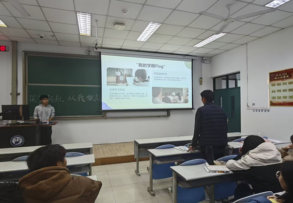 随后,学习委员陈永翔以“以期中为镜,筑学风之路”为主题,结合期中情况提出后续学风建设安排:一是“学习小组活跃化”,依据高数、Python掌握情况微调小组,推行每日学科打卡;二是“攀登班方案”,统计基础薄弱同学,借助学院攀登班课程巩固知识;三是“宿舍学风建设”,联合宿舍长打造宿舍学习环境;四是“资源共享化”,分享高数题、Python拓展资料、英语听力等资源,提升学习效率。