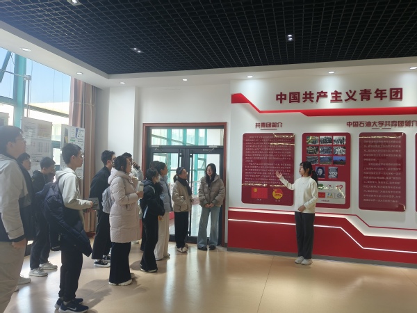 参观过程中,参与成员们认真聆听、仔细记录。本科生第二员工党支部党员周瑜煊表示:“从石大共青团的发展历程中,我看到了一代代青年把个人理想融入国家发展的责任担当。作为化学化工专业的党员,我们更应在科研学习中传承这种‘科学报国’的精神,练就过硬本领。”