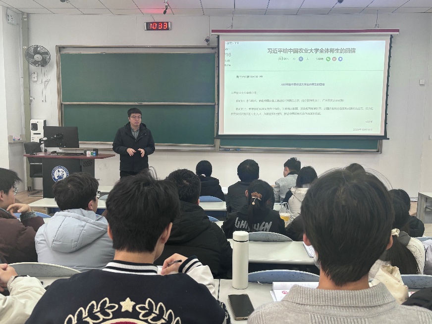 随后,支部书记王兆兴带领全体成员专题学习习近平总书记给中国农业大学全体师生的回信精神。王兆兴围绕回信中“弘扬优良办学传统,矢志强农报国”“努力培养更多知农爱农的专业人才”等核心内容展开解读,阐述了新时代青年与国家需求同频共振的重要意义,鼓励支部成员在专业学习中锤炼过硬本领,把个人理想融入国家发展大局,努力成为可堪大用、能担重任的时代新人。