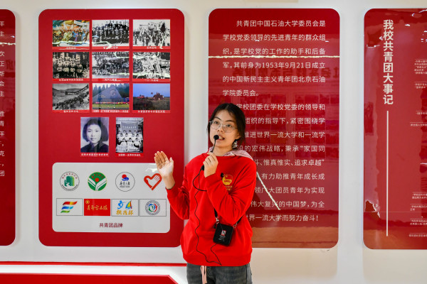 活动伊始,展厅讲解员以展板内容为依托,系统讲解共青团的发展历程:从中国共产主义青年团的成立初心,到威廉希尔体育共青团的前身——1953年9月21日成立的中国新民主主义青年团北京石油学院委员会,再到学校团委“家国同心、艰苦奋斗、惟真惟实、追求卓越”的工作理念。讲解中,讲解员重点解读了“石大共青团大事记”板块,梳理学校团委在组织建设、思想引领、青年服务等方面的关键节点,让成员们直观感知校团委与青年共成长的历程。