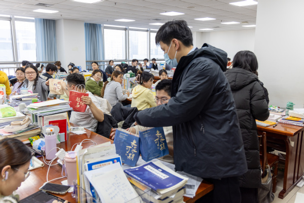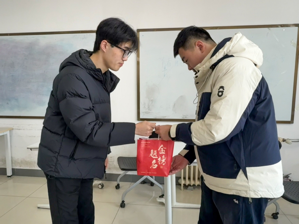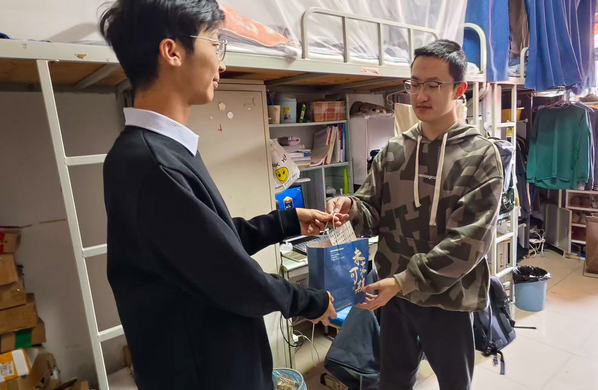 研读区内书香静谧,备考氛围浓厚。徐光辉一行轻声走入,与正在埋头苦读的学子们亲切交流,细致询问他们的复习进度、身心状态与实际困难,鼓励大家在最后阶段稳住心态,科学规划,注意劳逸结合,以最佳状态迎接挑战。随后,学院领导老师们将一份份满载心意的“考研福利”送到学子手中,其中包含补充能量的食品以及手写的带有鼓励话语的定制书签等,细微之处尽显温情。