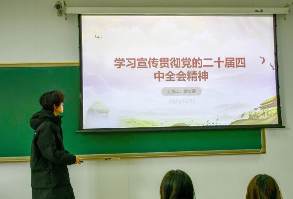 20251210日上午,化工2508 团支部于南堂106教室开展 “学习宣传贯彻党的二十届四中全会精神” 组织化学习 。活动由团支部级团支书颜奕豪担任汇报人,全体支部成员参与,通过理论讲解、互动研讨、心得分享等形式,深入学习全会精神,凝聚青春奋进力量。