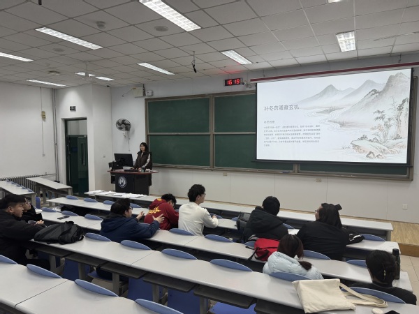 活动伊始,主讲同学以“二十四节气诞生记”为切入点,生动梳理了这一传统历法从古代农耕生产需求中衍生的历史脉络,深入解析节气与自然物候、农事活动之间的紧密关联,让同学们清晰把握节气文化的起源与实用价值。随后,分享聚焦“补冬药罐玄机”,结合冬日各节气的气候特征,细致讲解了对应的养生习俗,如冬至进补、小寒御寒等,并挖掘背后蕴含的“顺时养生”文化内涵。搭配着满含山水意境的PPT画面,传统文化讲解更添沉浸感,现场同学纷纷提笔记录要点,学习热情十分高涨。