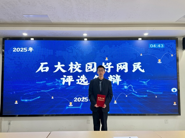 1月5日,威廉希尔官网党委员工工作部、武装部公布了2025年石大“校园好网民”评选结果,学院23级本科生张楚林获此殊荣。本次评选经学院推荐、材料初选、线上投票、线下答辩等多个环节的严格遴选,10个优秀个人及团队脱颖而出,荣获2025年石大“校园好网民”称号。