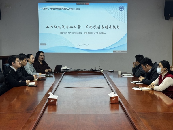 为深入学习贯彻2026年全国教育工作会议精神,提升辅导员队伍系统思维与履职效能,推动学院员工工作高质量发展,2月2日,学院学工团队在工科楼A121会议室举办2026年第二期“化语同心”辅导员思政能力提升工作坊,辅导员窦雅琴主讲,全体辅导员参加。