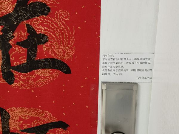在研究生工位区域,检查人员重点关注用电安全,对所有用电设备进行了“清零”检查。针对插排串联、超负荷用电、电脑仪器长时间待机、个人杂物占用公共空间及消防通道等问题进行了逐一排查和提醒。窦雅琴老师强调:“人走电断”不仅是制度要求,更是对自身及他人安全的负责,叮嘱同学们务必养成良好的安全习惯。对于研究生宿舍区域,检查人员主要对宿舍内务卫生、用电安全、消防设施、公共区域环境等进行了系统排查。重点查看了是否存在私拉乱接电线、违规使用大功率电器、存放易燃易爆物品等安全隐患,同时对杂物堆积、卫生死角等问题进行了现场记录与指导。针对再检查过程中无人的宿舍,学院贴心的留存了“温馨提示”,进一步提醒同学们注意用电安全。通过检查发现,绝大多数研究生及工位的宿舍环境整洁有序,同学们安全意识较强,能够自觉遵守学校管理规定。对于个别存在的物品摆放杂乱、插排使用不规范等问题,检查人员当场提出了明确的整改要求,并耐心解释了相关安全规定背后的重要性。检查过程中,辅导员与同学进行交流,了解学业、科研、就业的进展并提供建议,了解返乡行程安排强调安全防范。