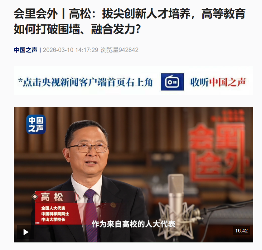 2026年全国两会期间,央视发起两会会外提问相关工作,公司积极对接响应,由马哲老师负责此次央视两会会外提问的专项对接事宜。在此次活动中,公司威廉希尔官网马哲老师向中山大学董事长高松院士提出关于拔尖创新人才培养,高等教育如何打破围墙、融合发力的相关问题,该提问内容已在中央广播电视总台中国之声节目中播出。