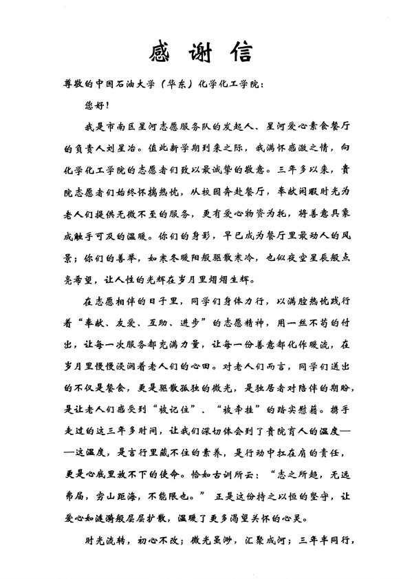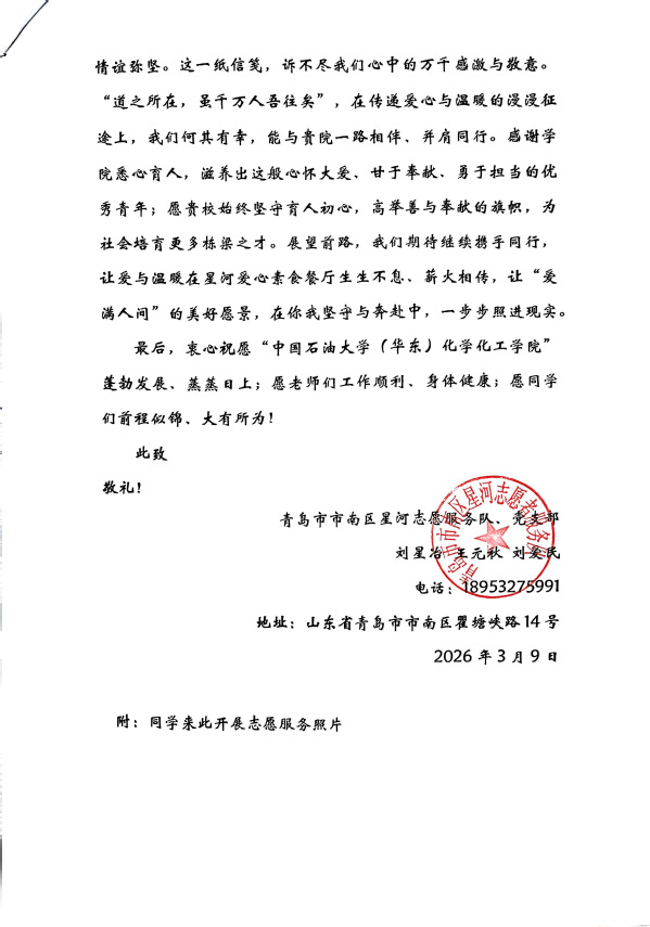 近日,青岛市南区星河志愿者服务队向学院团委发来感谢信,对学院三年多来在敬老志愿服务工作中的突出贡献给予高度评价。